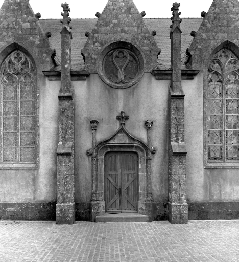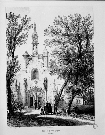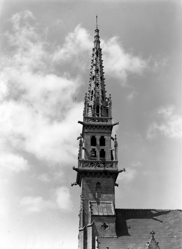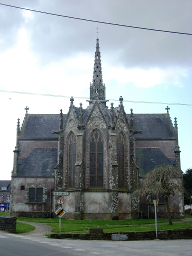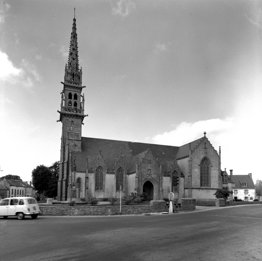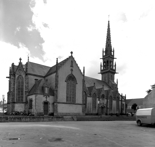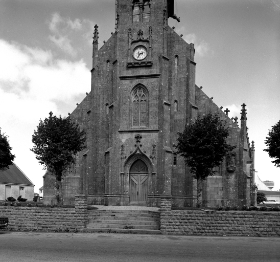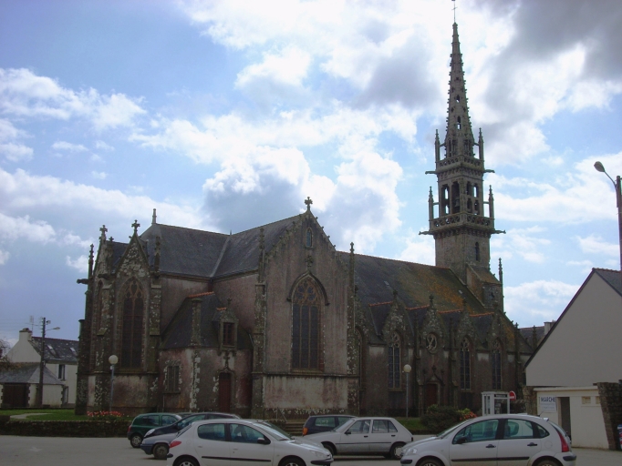 Eglise reconstruite entre 1868 et 1869 d'après les plans de l'architecte morlaisien Jules Boyer ; clocher de 1874. Porche sud portant la date de 1585.