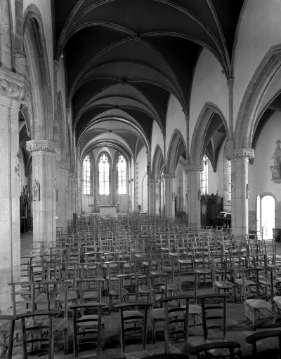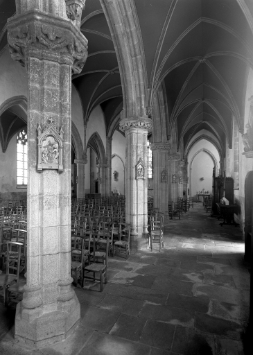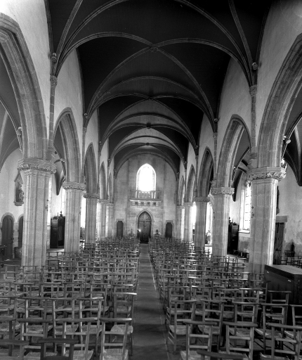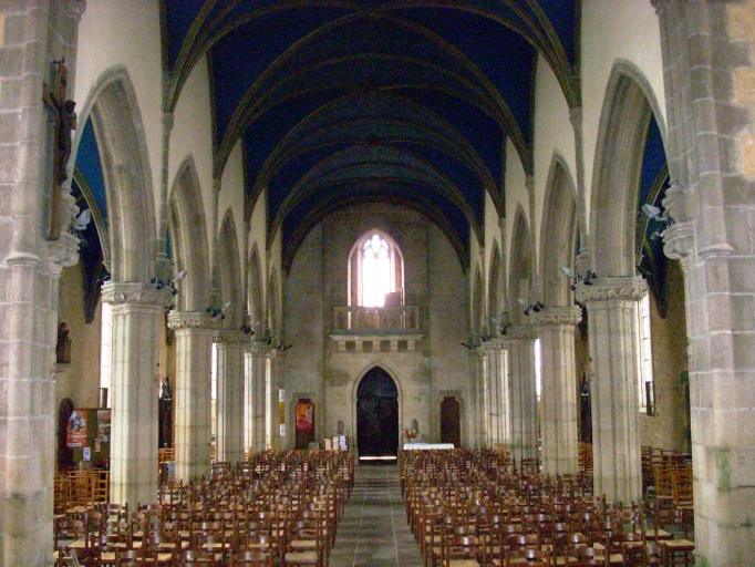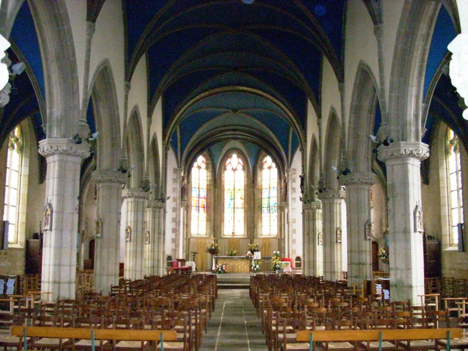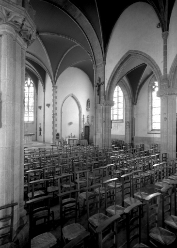 Plan en croix latine, de type nef obscure, à trois vaisseaux. Chevet polygonal à pans coupés flanqué de deux sacristies au nord et au sud, transept peu saillant. Tour ouest demi-hors-oeuvre coiffée d'une flèche octogonale à crochets. Remploi du porche sud hors-oeuvre. Gros oeuvre en moellon de granite enduit de chaux, pierre de taille aux chaînages d´angle et aux encadrements des portes et des baies, enduit ciment à l'extérieur. Sol couvert de dalles de granite. Lambris de couvrement et fausse voûte à croisées d´ogives, voussures reposant sur colonnettes engagées. Nef à cinq travées, arcs brisés reposant sur les chapiteaux à motifs végétaux portés par des piliers carrés cantonnés de colonnettes engagées.