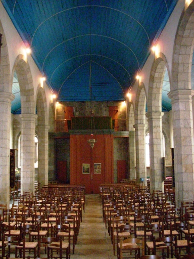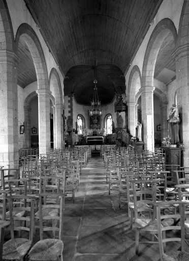 Plan en croix latine à trois vaisseaux ; abside du choeur en cul-de-four couverte d'un toit à croupe ronde ; flanquée de deux petites sacristies en appentis. Clocher hors-oeuvre composé de deux chambres à galeries amorties par un lanternon. Gros oeuvre en moellon de granite enduit de ciment peint en blanc à l'exception des chaînages d'angle et des encadrements de baies en pierre de taille de granite. Nef de type haute à quatre travées, piliers carrés à pans coupés, arcs en plein cintre, lambris de couvrement peint en bleu. Sol en dalle de granite.