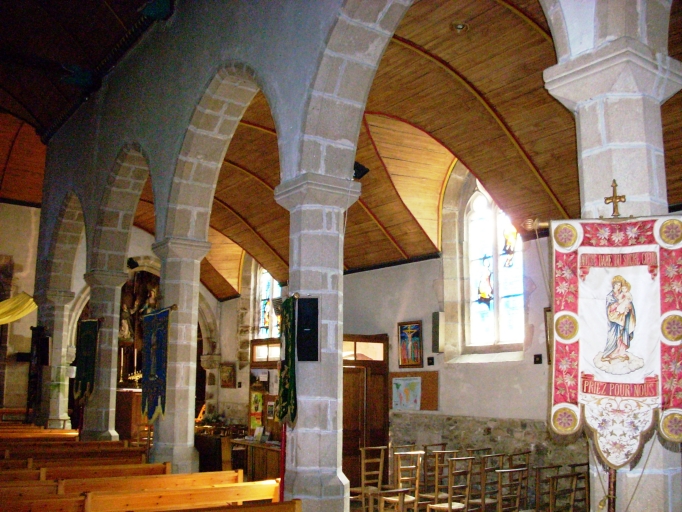 Plan en croix latine, avec nef de type obscur, à six travées. Chevet polygonal flanqué d´une sacristie au sud, ces deux derniers en pierre de taille de granite. Porche sud hors-oeuvre, encadré de colonnettes cannelées à chapiteaux ioniques, avec dix niches à coquilles garnies de leurs statues d´apôtres. Façade occidentale partiellement en pierre de taille de granite. Clocher à une galerie, à chambre ajourée surmontée d´une flèche octogonale à crossettes encadrée à sa base par quatre frontons ajourés. Gros oeuvre en moellon et moellon équarri de schiste et granite partiellement enduit de ciment, pierre de taille de granite visible aux chaînages d´angle et aux encadrements des baies et des portes. Lambris de couvrement avec sablières et entraits engoulés. Arcades en arc brisé, en tiers-point reposant sur piliers octogonaux. Sol couvert de dalles de granite et de ciment.