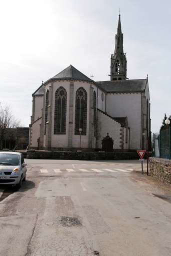 Eglise de plan en croix latine à trois vaisseaux ; chevet à pans coupés flanqué de deux sacristies de plan rectangulaire. Porche sud hors-oeuvre. Clocher en pierre de taille de granite à chambre de cloches ouverte et à galerie en encorbellement, base de la flèche octogonale à galerie à quatre gâbles ajourés. Gros oeuvre en moellon de schiste et de granite recouvert d'un léger enduit. Encadrement des baies en kersantite et microdiorite. Nef à cinq travées éclairée par des baies hautes, piliers octogonales, arcs brisés, lambris de couvrement peint en bleu sur fausses voûtes à croisées d'ogives reposant sur des culots à décor végétal situés entre les fenêtres hautes. Sol couvert de dalles de granite.
