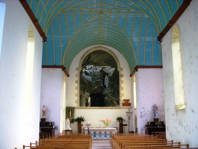 Plan en croix latine ; chevet plat flanqué au sud d'une petite sacristie de plan rectangulaire couverte d'un toit en appentis en zinc. Pignon ouest percé de baies aveugles et coiffée d'un clocheton. Transept légèrement saillant. Reconstitution de la grotte de Lourdes dans le chevet. Nef éclairée par trois baies en arc brisé. Lambris de couvrement peint en bleu, voussures jaunes. Enduit intérieur peint en blanc. Sol couvert de dalles de granite. Gros oeuvre en moellon enduit de ciment, à l'exception des chaînages d´angle et des encadrements des baies, en pierre de taille de granite.