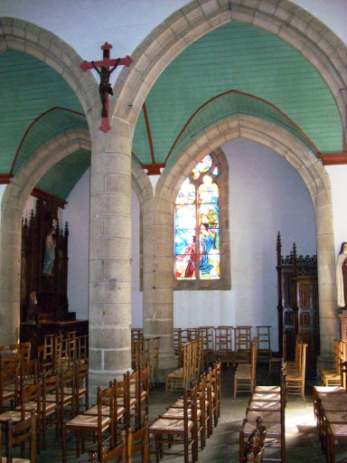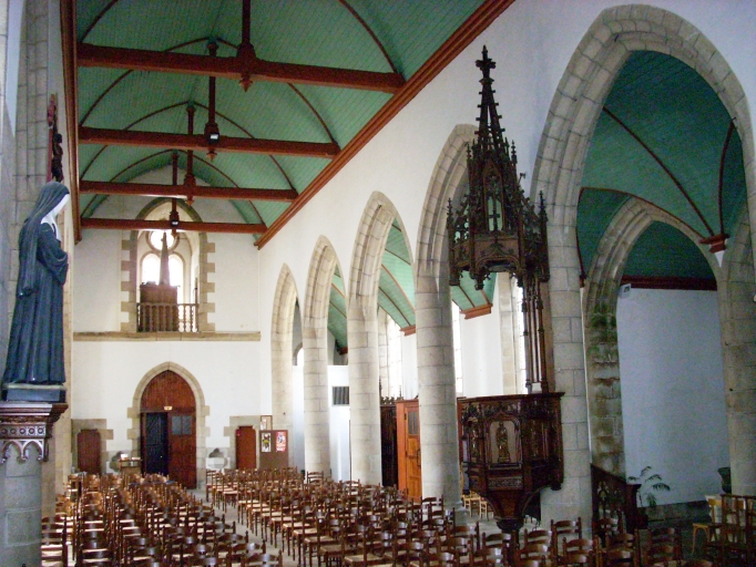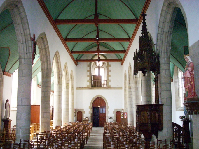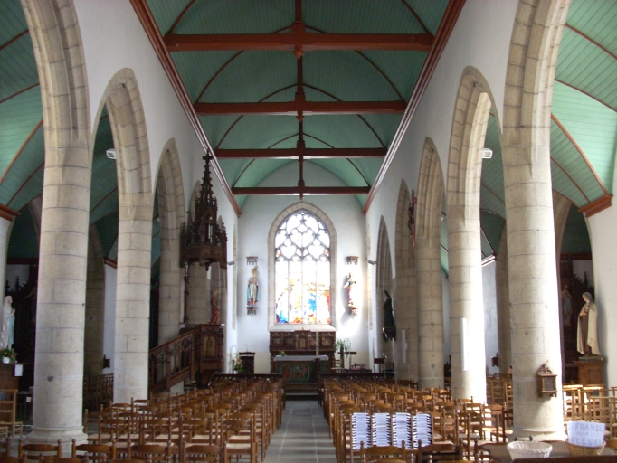 Plan en croix latine à trois vaisseaux. Façade occidentale en pierre de taille surmontée d´un clocher dans-oeuvre à galerie et à chambre de cloches ajourée. Flèche ajourée encadrée à sa base par quatre lanternons et quatre gâbles. Nef obscure à six travées. Choeur peu profond à chevet plat flanqué au sud d´une sacristie de plan carré avec toit en pavillon. Chapelles latérales formant faux-transept ouvertes sur les bas-côtés par une double arcade, au niveau des quatrième et cinquième travées. Arcades en tiers-point pénétrant directement dans les colonnes. Lambris de couvrement peint en vert avec entraits en marron. Sol couvert de dalles de granite.