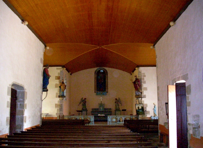 Plan en croix latine à vaisseau unique et à chevet plat avec niche. Clocher-mur avec chambre de cloches ajourée et flèche octogonale à crossettes encadrée par quatre gâbles. Gros oeuvre en pierre de taille et moellon de granite, remploi des portes ouest et sud du 16e siècle dans. Nef obscure avec lambris de couvrement. Sol couvert de dalles de granite. Murs enduits de ciment peint en blanc et orange dans la nef, saumon dans le choeur.