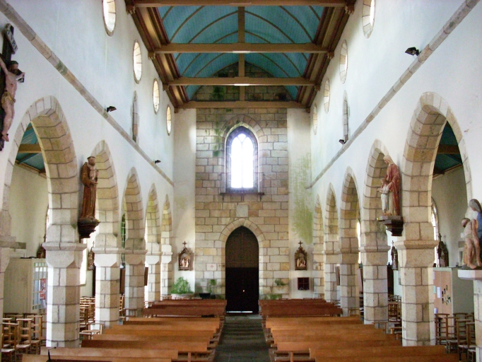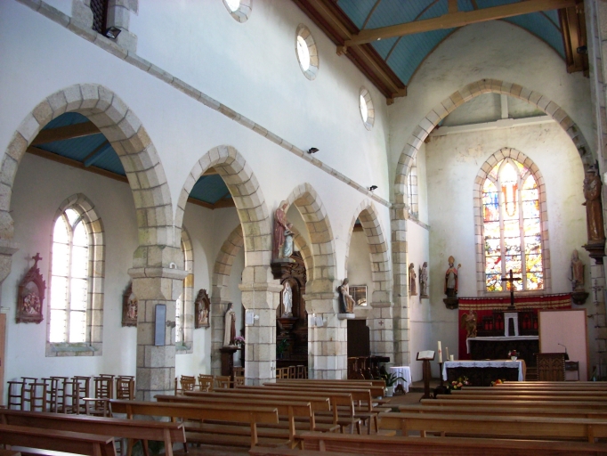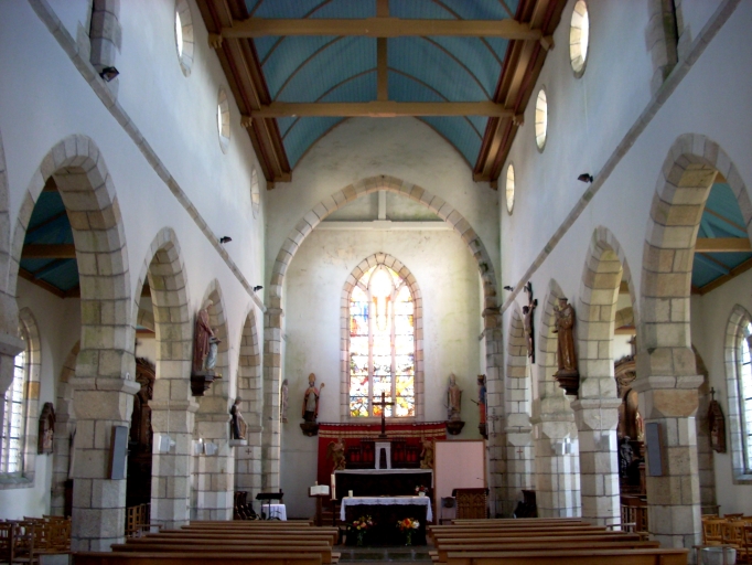 Edifice de plan en croix latine à trois vaisseaux. Clocher avec galerie ajourée ceinturant la chambre des cloches et flèche octogonale ajourée ornée de crochets et encadrée de quatre lanternons et de quatre gâbles à sa base. Gros oeuvre en moellon de granite couvert d´un enduit, pierre de taille de granite apparente aux encadrements des baies et des portes, aux chaînages d´angle et au massif occidental. Nef à cinq travées éclairée par des oculi, et couverte d'un lambris peint en bleu, avec sablières, entraits et poinçons peints en marron. Choeur peu saillant à chevet plat flanqué de deux sacristies, l´une au nord, l´autre au sud, couvertes de tôle galvanisée. Faux transept composé de chapelles latérales. Arcades en arc brisé reposant sur les chapiteaux nus des piliers carrés chanfreinés. Sol couvert de dalles de granite.