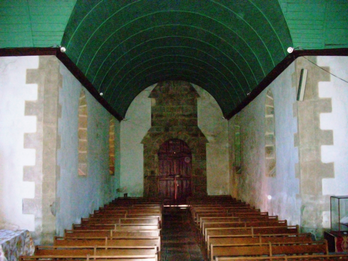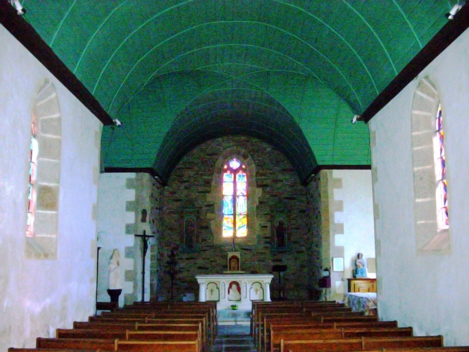 Plan en croix latine, à vaisseau unique et à chevet plat, flanqué d´une sacristie au nord. Clocher dans-oeuvre, avec chambre de cloche ajourée et flèche carrée. Gros oeuvre en moellon de granite partiellement enduit à l´exception des encadrements des portes et des baies en arc brisé, des chaînages d´angle et du massif occidental en pierre de taille de granite. Lambris de couvrement peint en vert, sol couvert de dalles de granite.