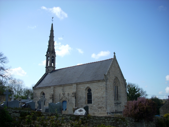 Au 11e siècle ce lieu fut donné à l´abbaye de Landévennec par un saint nommé « Uuicon » qui aurait été le patron de l´ancienne chapelle Saint-Veguen située non loin du village de Gulvain (une pierre provenant de cette chapelle porte la date de 1655). Ancienne église tréviale, déplacée, reconstruite et réduite de moitié en 1880, comme l´indique la date gravée sur le chevet, d'après les plans de l´architecte Jules Boyer. Remploi des portes sud et ouest provenant de l'ancienne chapelle Saint-Veguen. Touchée par la foudre le 18 octobre 1924, elle est restaurée en 1925 comme l´indique une inscription dans le ciment sur le sol de la nef. Un écu aux armes d´un abbé Tanguy de Landévennec a été incorporé au chevet. Trois pierres tombales dans la nef portent les dates de 1764, 1768 et 1790. Le mur nord de la sacristie porte la date de 1888. Les vitraux ont été exécutés en 1998/2002 par l´atelier Le Bihan de Quimper.