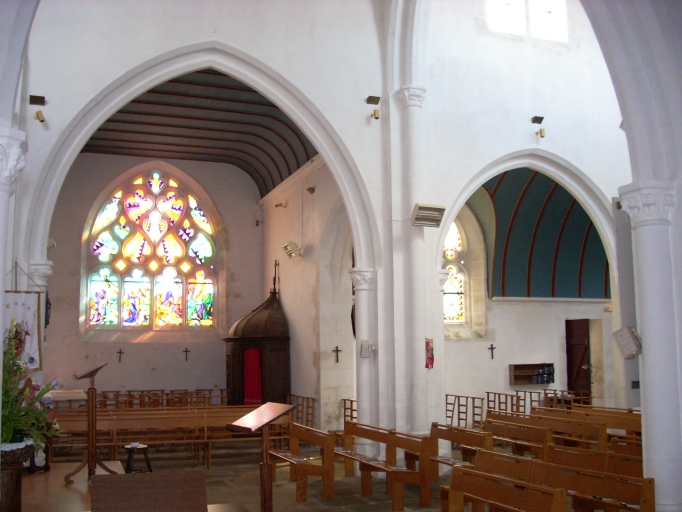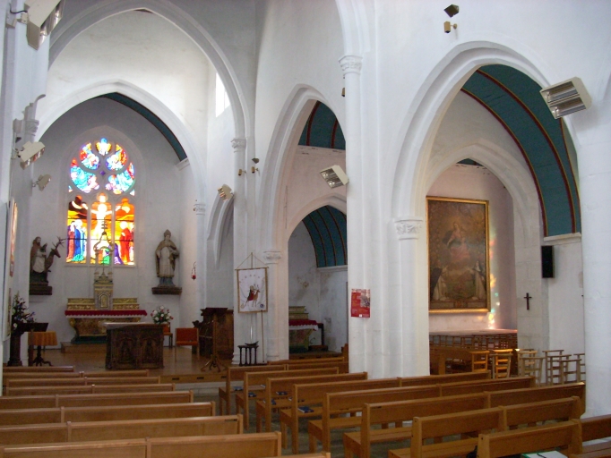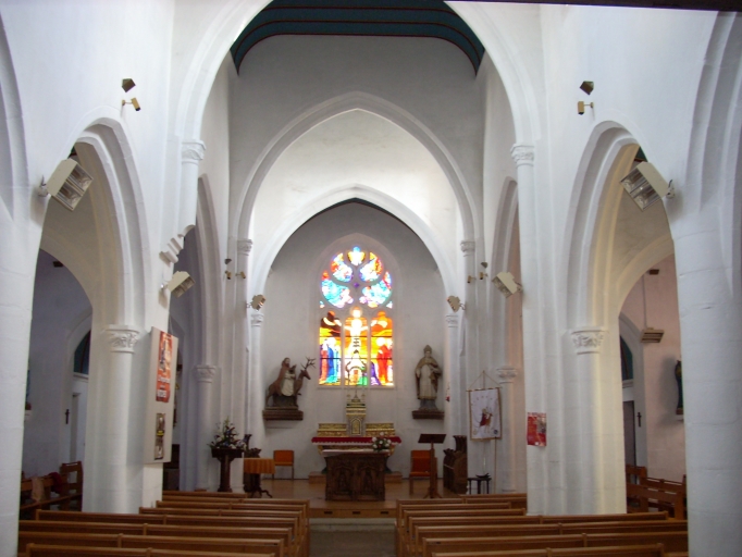 Plan en croix latine à trois vaisseaux. Sacristie hors-oeuvre, de plan hexagonal à comble à surcroît. Porche sud avec accolade à fleuron et pinacles terminés en consoles et nord hors-oeuvre. Clocher à deux chambres de cloches amorties d´un dôme à lanternon encadré à sa base de quatre pinacles. Gros oeuvre en moellon et pierre de taille, le tout peint en blanc à l´intérieur à l´exception du massif occidental. Sol couvert de dalles de granite. Faux transept ouvrant sur la nef par une arcade. Choeur peu profond à chevet plat, encadré de deux chapelles latérales ouvertes sur le choeur et sur les bras du faux transept par une arcade. Nef à trois travées couverte d'un lambris peint en bleu et nervures en rouge, éclairée par des fenêtres hautes géminées. Arcades en arc brisé pénétrant directement dans les colonnes.