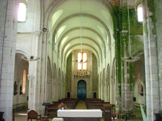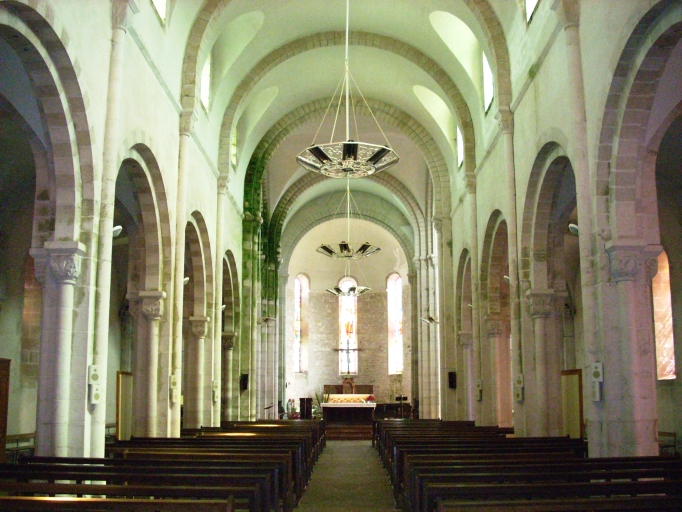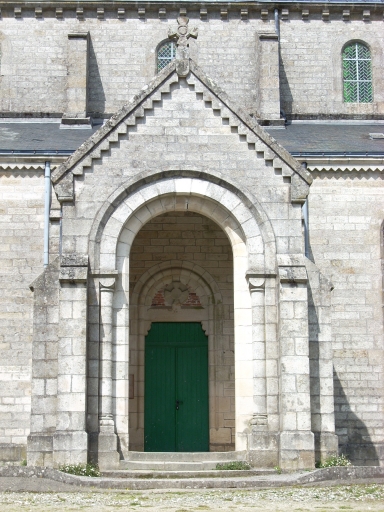 Edifice de plan en croix latine, à trois vaisseaux. Chevet semi-circulaire flanqué au nord d'une sacristie hors-oeuvre de plan octogonal, à comble à surcroît. Clocher semi-hors-oeuvre flanqué d´une tour octogonale jusqu´à la chambre des cloches fermée amortie d'une flèche ajourée, encadrée à sa base par quatre frontons et quatre clochetons aigus. Gros oeuvre en moellon et brique couvert partiellement d´un enduit clair, à l´exception du massif occidental, des encadrements des baies et des chaînages d´angle, en pierre de taille de granite. Choeur en hémicycle flanqué de deux chapelles latérales ouvrant sur les bras du transept. Nef à cinq travées éclairée par des fenêtres hautes et flanquée de deux porches symétriques hors-oeuvre, au niveau de la troisième travée. Voûte en plein cintre avec grandes arcades reposant sur des chapiteaux soutenus par des colonnettes engagées de fond. Arcades en plein cintre pénétrant dans les piliers à colonnes engagées portant des chapiteaux à motifs végétaux et animaliers. Sol couvert de dalles de granite.