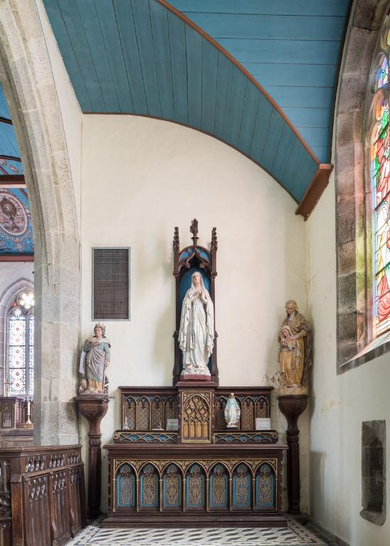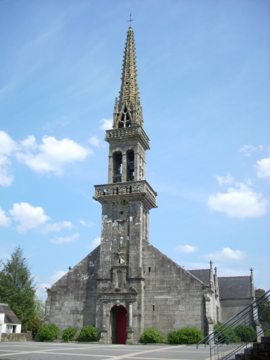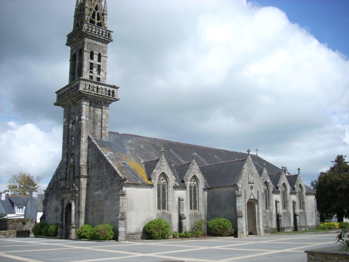 Etat sanitaire satisfaisant. Elévation ouest de style classique. Edifice de style néogothique. Clocher cornouaillais. Cette église présente des similitudes avec celle de La Feuillée (porche et flèche), conçue par le même architecte Jules Boyer. Une stèle de l´âge du fer s'élève à l'est du chevet.