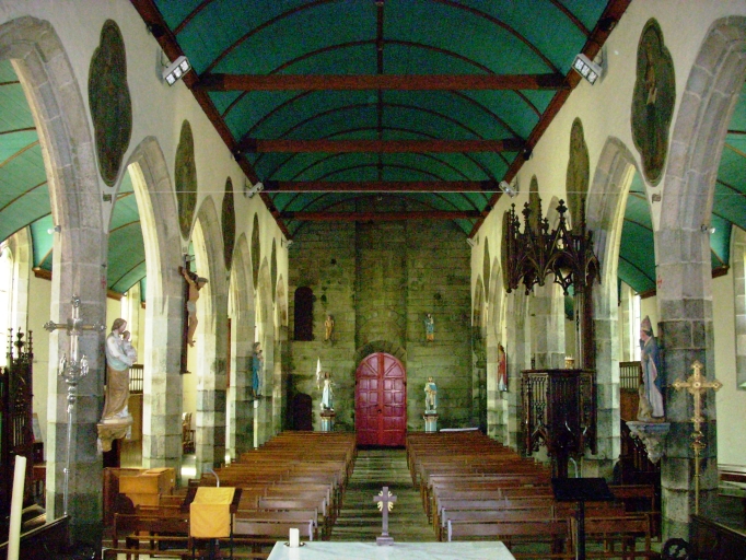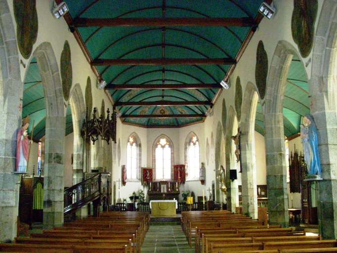 Plan allongé, à trois vaisseaux sans transept. Porche sud hors-oeuvre. Choeur profond à chevet à pans coupés flanqué de deux sacristies dans-oeuvre. Clocher demi-hors-oeuvre à double galerie, chambre de cloches ajourée surmontée d´une flèche octogonale ornée de crossettes et encadrée à sa base de quatre frontons ajourés et de quatre pinacles. Gros oeuvre en moellon de granite enduit à l´exception des encadrements des baies, des chaînages d´angle et du massif occidental en pierre de taille de granite. Nef à six travées séparée des bas-côtés par des arcades en arc brisé pénétrant directement dans les piliers octogonaux. Lambris de couvrement peint en bleu, nervures, entraits et sablières marrons. Sol couvert de dalles de granite.