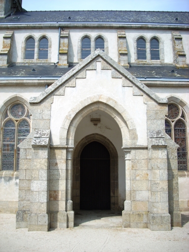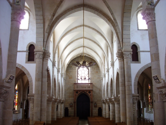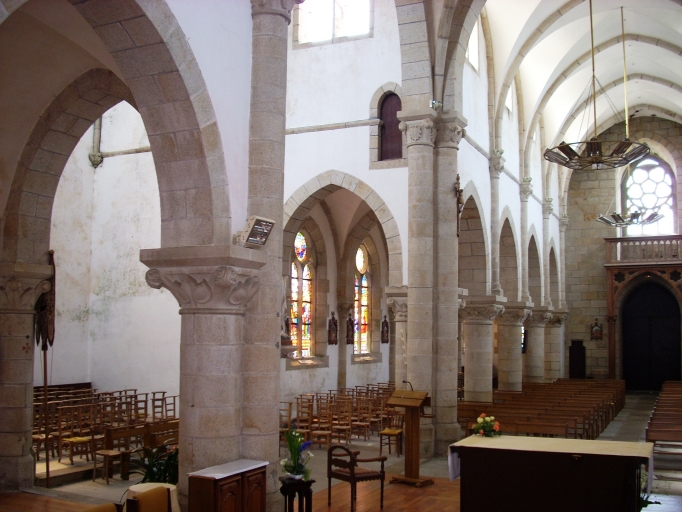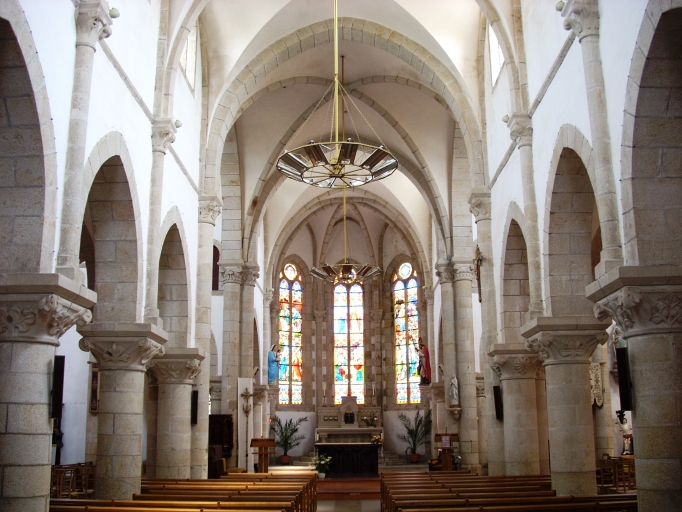Plan en croix latine, trois vaisseaux. Chevet à pans coupés flanqué d´une sacristie à comble à surcroît et d´une tourelle circulaire au nord. Porches sud et nord hors-oeuvre, au niveau de la troisième travée. Clocher à chambre de cloches à galerie amortie d´une flèche octogonale ajourée encadrée à sa base de quatre frontons ajourés et de quatre pinacles. Gros oeuvre en moellon de granite enduit à l´exception des encadrements des baies et des chaînages d´angle en pierre de taille de granite. Nef haute à quatre travées éclairée par des baies géminées. Voûte d´ogives. Arcades en arc brisé reposant sur les chapiteaux à motifs végétaux soutenus par des colonnes. Bas-côtés voûtés d´arêtes. Choeur flanqué de deux chapelles. Sol couvert de ciment et de dalles de granite.