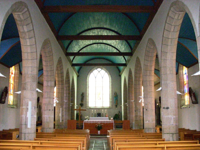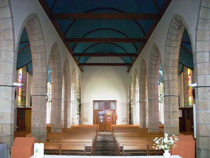 Edifice de plan rectangulaire, à trois vaisseaux. Pas de transept. Chevet plat. Deux sacristies au niveau du choeur formant faux transept. Elévation ouest hors-oeuvre coiffée d'une tour avec chambre de cloches amortie d´une flèche octogonale ornée de crossettes et encadrée à sa base par quatre frontons ajourés et quatre pinacles. Gros oeuvre en moellon de granite enduit, à l´exception des encadrements des baies, des chaînages d´angles et du massif occidental, en pierre de taille de granite. Nef à sept travées séparée des bas-côtés par des arcades en arc brisé pénétrant directement dans les piliers octogonaux. Lambris de couvrement peint en bleu, entraits et sablières en marron. Sol couvert de dalles de granite.