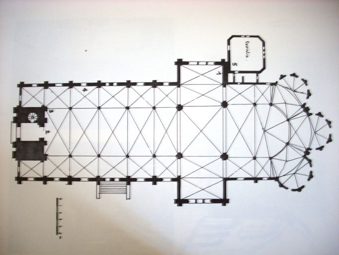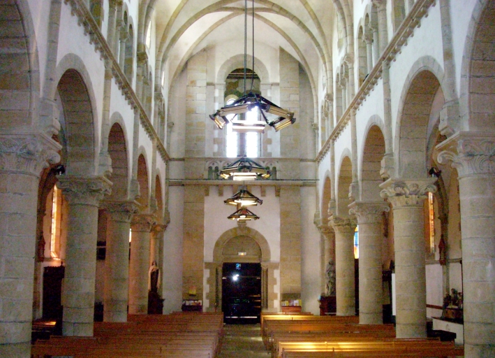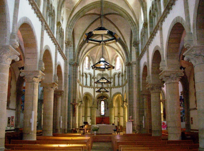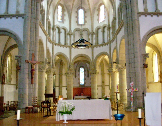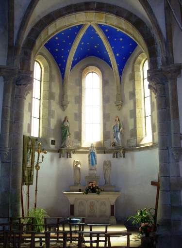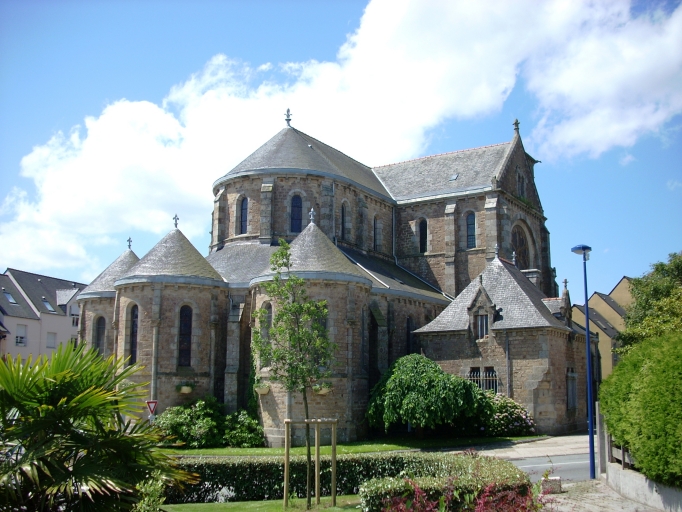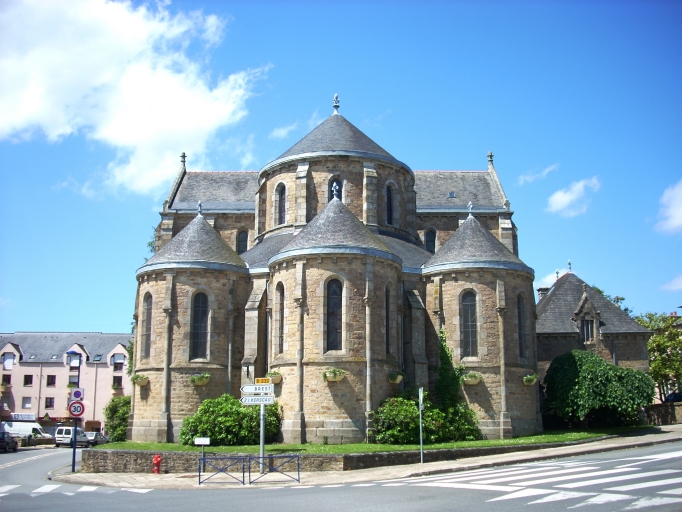Plan croix latine, avec transept peu saillant. Chevet semi-circulaire flanqué au nord d´une sacristie à comble à surcroît. Tour à chambre de cloches sans flèche. Gros oeuvre en pierre de taille de granite et de microdiorite quartzique. Nef à trois vaisseaux à cinq travées. Choeur à déambulatoire flanqué de trois chapelles rayonnantes. Nef couverte d'une voûte à croisée d´ogives et à voûtes d´arêtes éclairée par des fenêtres hautes. Arcades plein-cintre reposant sur les chapiteaux des colonnes. Massif occidental portant tribune. Sol couvert de dalles de granite et de microdiorite quartzique.