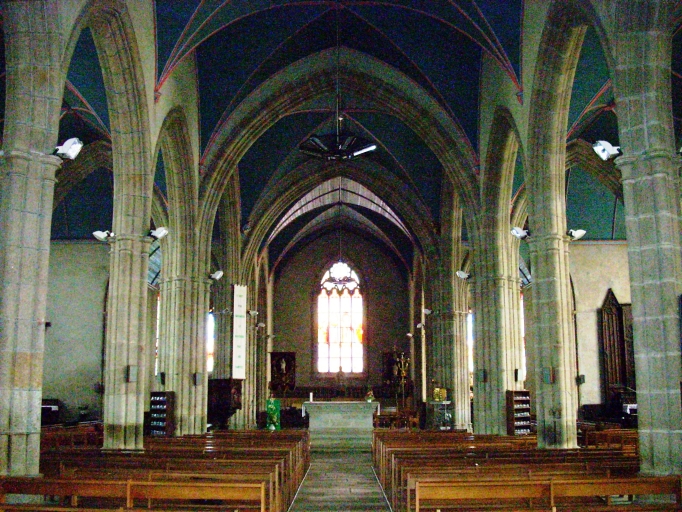 Plan en croix latine. Chevet plat flanqué d´une sacristie de plan polygonal dans l´angle nord-est. Porches sud et nord hors-oeuvre. Clocher à deux chambres de cloches et à trois galeries amortis d´une flèche octogonale encadrée à sa base de quatre pinacles et de quatre frontons ajourés. Gros oeuvre en pierre de taille de granite partiellement enduit de ciment. Nef à trois vaisseaux et cinq travées. Choeur de deux travées flanqué de deux chapelles latérales. Arcades en arc brisé pénétrant directement dans les piliers carrés à colonnettes engagées. Lambris de couvrement peint en bleu et nervures rouges. Sol couvert de dalles de granite.