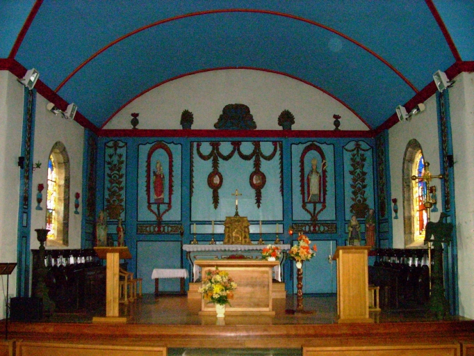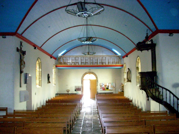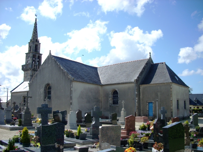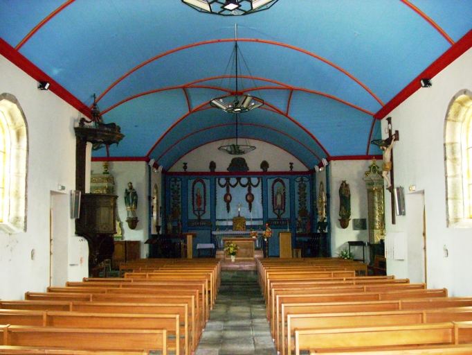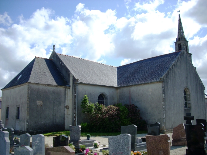 Plan en croix latine. Vaisseau unique. Chevet plat flanqué d´une sacristie à l´est. Clocher à deux étages de cloches à galerie, amortis d´une flèche octogonale ajourée encadrée de quatre pinacles. Gros oeuvre en moellon de granite enduit de ciment, à l´exception des encadrements des baies et des chaînages d´angle, en pierre de taille de granite et de kersantite. Lambris de couvrement peint en bleu et nervures rouges. Sol couvert de dalles de granite.