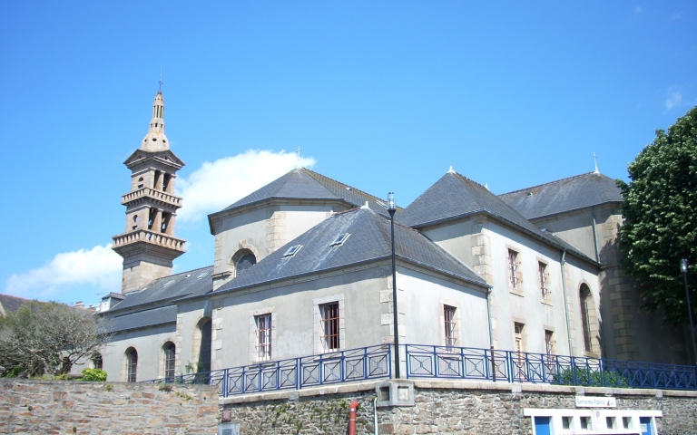 Edifice construit d´après les plans de l´architecte Joseph Bigot de 1855 à 1856 (date de 1856 au-dessus de la porte ouest), par l'entrepreneur Le Bot. Clocher détruit en 1944 et reconstruit en 1953 d´après les plans de l´architecte Chevalier.