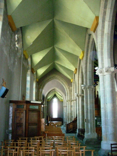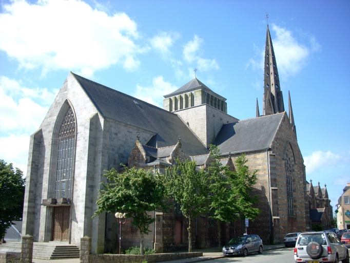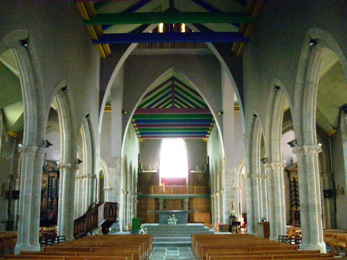 Plan en croix latine à trois vaisseaux. Chevet plat. Tour de croisée ajourée couverte d'un toit en pavillon en béton. Clocher à galerie et à chambre de cloches ajourée, amortie d´une flèche en béton, ajourée et à crossettes. Porches nord et sud hors-oeuvre au niveau de la troisième travée. Gros oeuvre en pierre de taille de kersantite, granite et microdiorite quartzique, partiellement enduit. Nef obscure à cinq travées. Choeur à trois travées. Nef : arcades en arc brisé reposant sur les chapiteaux des colonnettes engagées des piliers. Couvrement en plaque de bois, imitant la voûte sur croisée d'ogives dans les bas-côtés. Sol couvert de dalles de granite et de kersantite.