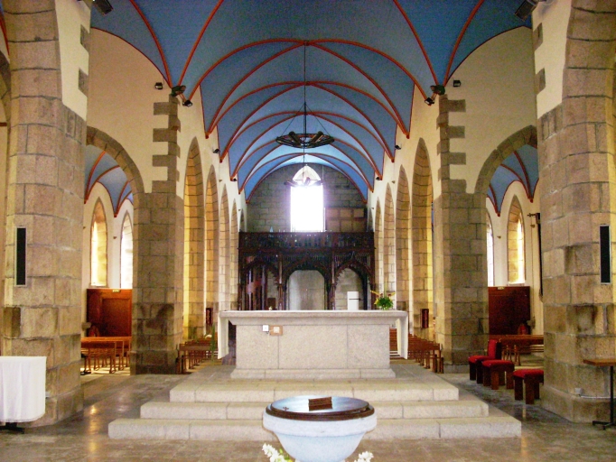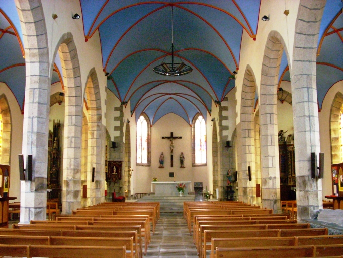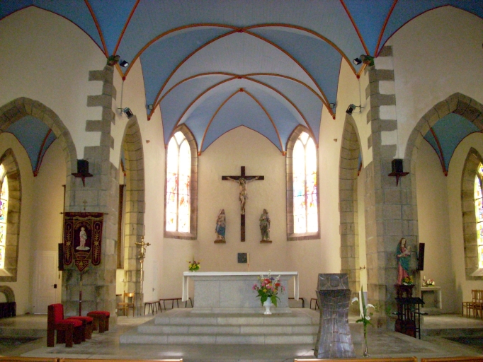 Plan en croix latine à trois vaisseaux. Chevet à pans coupés, flanqué au nord d´une sacristie hors-oeuvre, de plan octogonal à comble à surcroît, elle-même flanquée à l´ouest d´une tourelle. Clocher à une galerie et à deux étages de cloches amortis d´un petit dôme. Gros oeuvre en moellon de granite enduit de ciment à l´exception des encadrements des baies et des chaînages d´angle en pierre de taille de granite. Nef obscure à cinq travées. Lambris de couvrement peint en bleu et voussures en rouge. Arcades en arc brisé pénétrant directement dans les piliers octogonaux. Massif occidental portant tribune. Choeur profond flanqué de deux chapelles latérales. Sol couvert de dalles de granite.