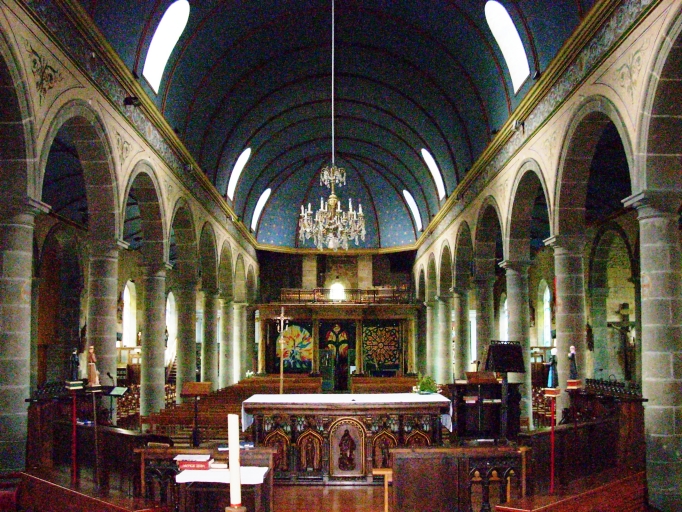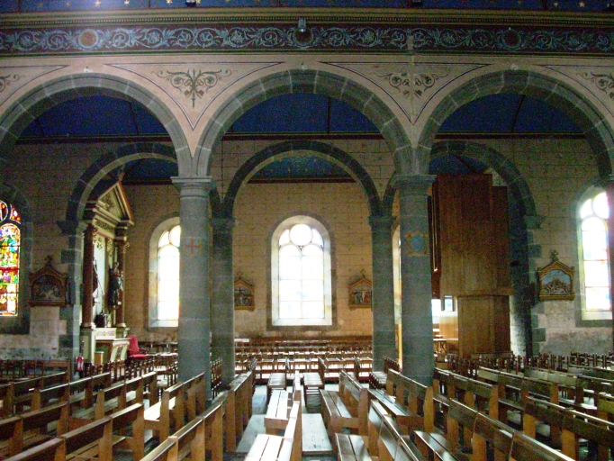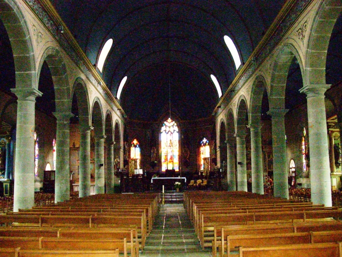 Plan en croix latine à trois vaisseaux. Porche sud hors-oeuvre. Chevet à pans coupés flanqué de deux sacristies, l´une hors-oeuvre de plan rectangulaire au nord et l´autre dans-oeuvre au sud. Clocher à deux galeries et à deux étages de cloches amortis d´une flèche ajourée octogonale ornée de crossettes et encadrée à sa base par quatre pinacles. Gros oeuvre en moellon et moellon équarri de granite enduit de ciment à l´exception des encadrements des baies et des chaînages d´angle en pierre de taille de granite. Nef obscure à neuf travées avec deux chapelles latérales à trois travées formant faux-transept. Arcades plein-cintre reposant sur les chapiteaux des colonnes. Lambris peint (étoiles sur fond bleu) et voussures peintes en rouge, jaune et vert. Enduit crème décoré de motifs géométriques. Massif occidental portant tribune. Sol couvert de dalles de granite.