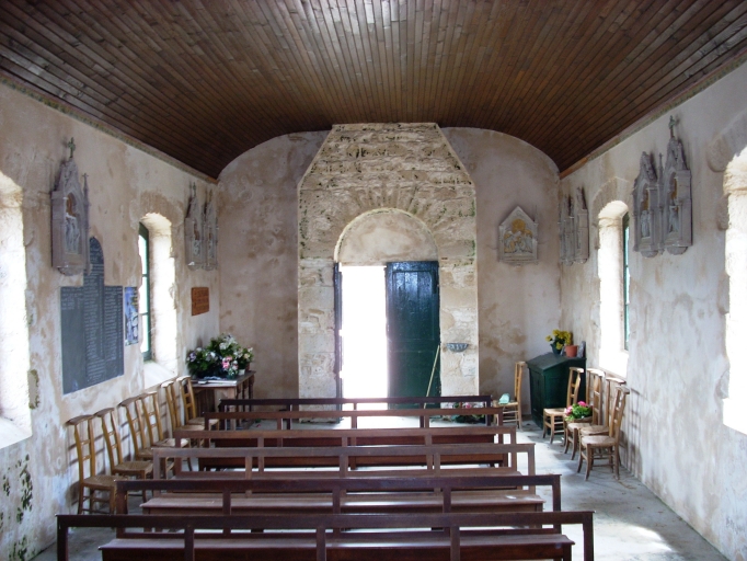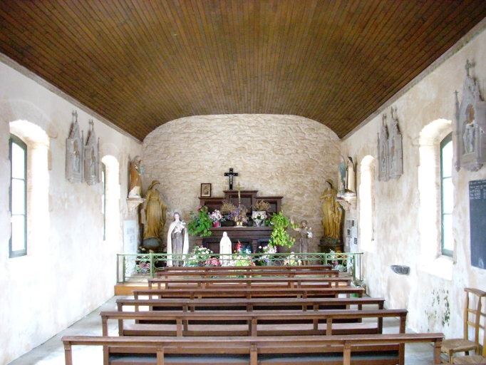 Plan rectangulaire à vaisseau unique. Chevet plat. Pignon ouest coiffé d'un clocheton à chambre de cloches ajourée amorti d´un petit dôme carré. Gros oeuvre en moellon de granite partiellement enduit de ciment, à l´exception des encadrements des baies et des chaînages d´angle, en pierre de taille de granite. Lambris de couvrement peint en marron. Sol couvert de ciment.