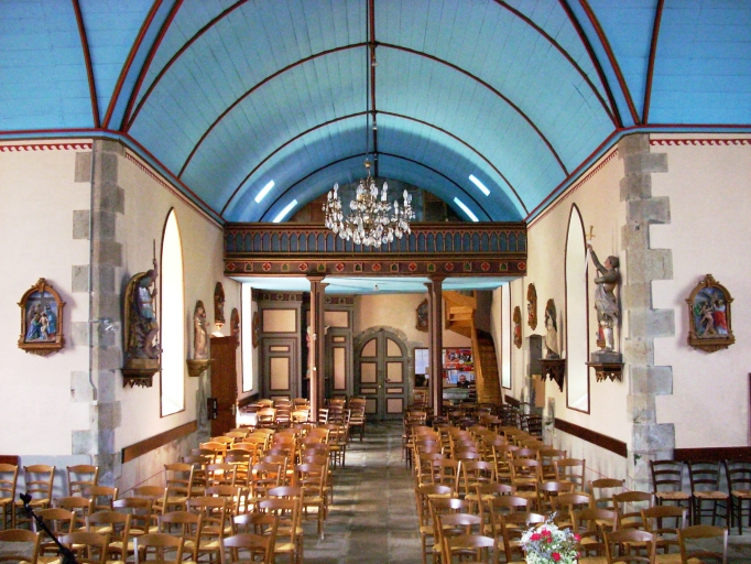 Plan en croix latine à vaisseau unique. Chevet plat. Clocher dans-oeuvre à galerie et à deux chambres de cloches amortie d´un petit dôme. Gros oeuvre en moellon de granite enduit de ciment, à l´exception des encadrements des baies et des chaînages d´angle, en pierre de taille de granite. Lambris de couvrement peint en bleu, nervures rouges. Enduit saumon. Sol couvert de dalles de granites. Tribune à l'ouest.