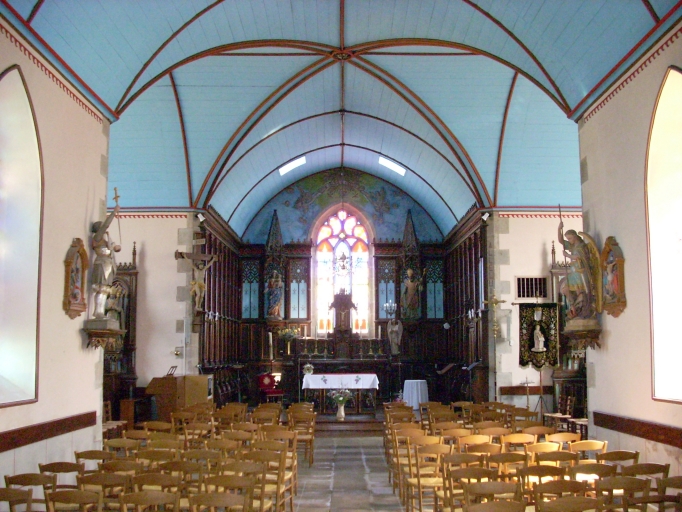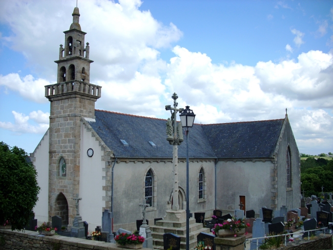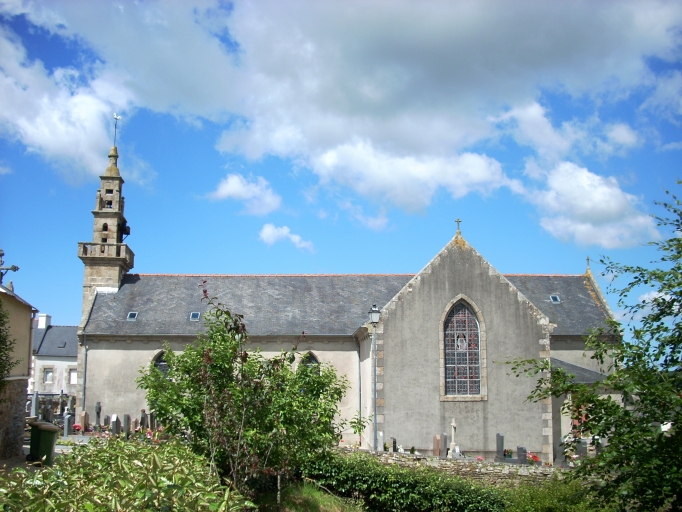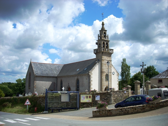 Edifice construit en 1860 (date sur le clocher). Remploi de la porte nord provenant de l´ancienne église du 18e siècle, portant les armes des Tournemine de Trouzilit.