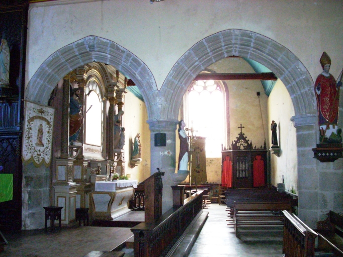 Plan allongé de trois vaisseaux. Chevet à noues multiples, flanqué au sud d´une sacristie hors-oeuvre de plan hexagonal. Clocher-porche hors-oeuvre à chambre de cloches surmonté d´un dôme amorti de trois lanternons. Gros oeuvre en moellon de granite enduit de ciment à l´exception des encadrements des baies et des chaînages d´angle en pierre de taille de granite. Nef à sept travées couverte d´un lambris bleu à nervures rouges. Arcades en arc brisé pénétrant directement dans les colonnes. Chapelle latérale sud ouvrant sur le bas-côté au niveau des sixième et septième travées. Sol couvert de ciment.