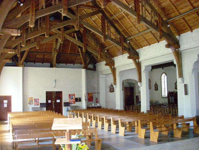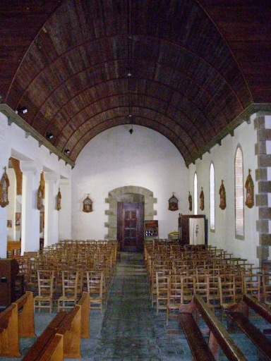 Plan irrégulier à deux vaisseaux. Chevet plat flanqué d´une sacristie au nord, dans le prolongement de l´ancienne nef. Clocher-mur à chambre de cloches ajourée, amortie d´une flèche carrée ornée de crossettes et encadrée à sa base par quatre frontons et quatre pinacles. Gros oeuvre en moellon de granite enduit de ciment à l´exception du massif occidental, des encadrements des baies et des chaînages d´angle en pierre de taille de granite. Nef à quatre travées avec charpente apparente, flanquée d´une grande chapelle latérale au sud, couverte d´un lambris. Arcades plates reposant sur les chapiteaux des piliers carrés chanfreinés. Sol couvert de ciment.