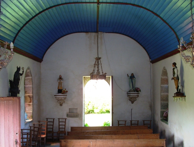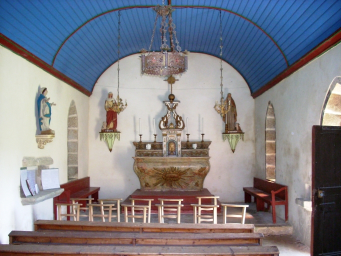 Plan rectangulaire à vaisseau unique. Chevet plat. Pignon ouest coiffé d'une chambre de cloches ajourée et amortie d´un petit dôme. Gros oeuvre en moellon et moellon équarri de granite, à l´exception des encadrements des baies et des chaînages d´angle, en pierre de taille de granite. Lambris de couvrement peint en bleu, nervures rouges. Enduit de ciment crème. Sol en terre battue.
