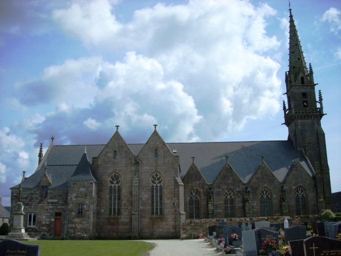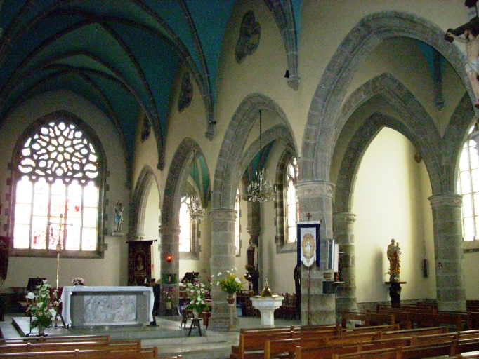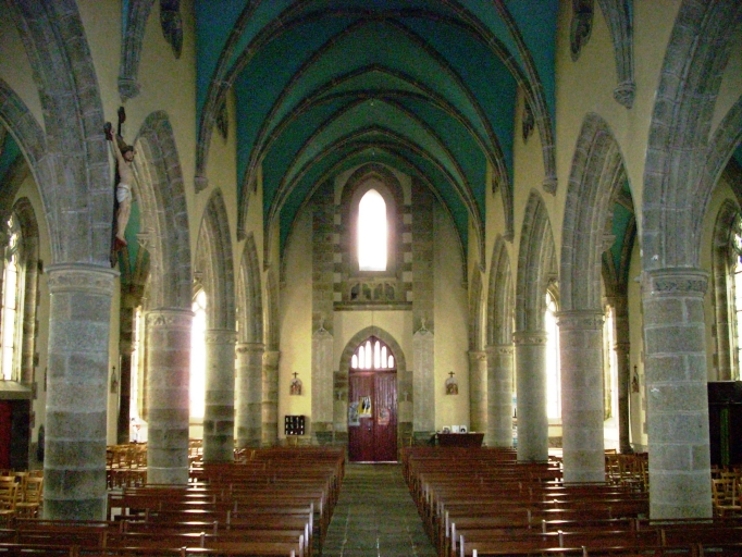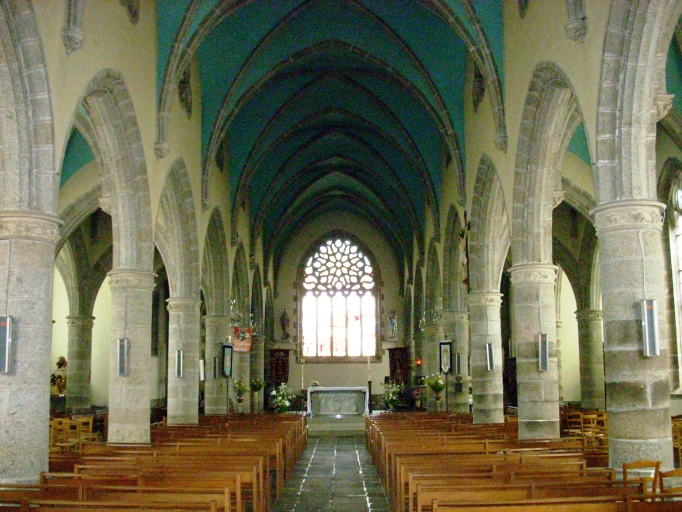 Plan en croix latine à trois vaisseaux. Chevet plat flanqué au nord d´une sacristie de plan rectangulaire, à comble à surcroît avec tourelle d'escalier carrée à l´ouest. Clocher hors-oeuvre, flanqué au nord-ouest d´une tourelle d´escalier, à une galerie et à chambre de cloches ajourée amortie d´une flèche octogonale ajourée ornée de crossettes et encadrée à sa base par quatre gables et quatre pinacles. Gros oeuvre en pierre de taille de granite. Nef à huit travées à voûte à croisée d´ogives. Arcades en arc brisé reposant sur les chapiteaux des colonnes. Sol couvert de dalles de granite.