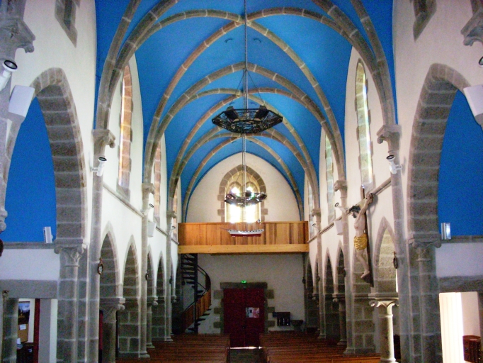 Plan en croix latine à trois vaisseaux. Chevet à pans coupés. Clocher hors-oeuvre à chambre de cloches ajourée amortie d´une flèche octogonale encadrée à sa base par quatre gables ajourés. Gros oeuvre en moellon de granite enduit de ciment à l´exception des encadrements des baies et des chaînages d´angle en pierre de taille de granite. Nef à trois doubles travées couverte d´une voûte à croisée d´ogives bleue, nervures reposant sur les colonnettes engagées de fond. Chapelles latérales au niveau de la troisième travée formant faux transept. Sol couvert de dalles de granite.
