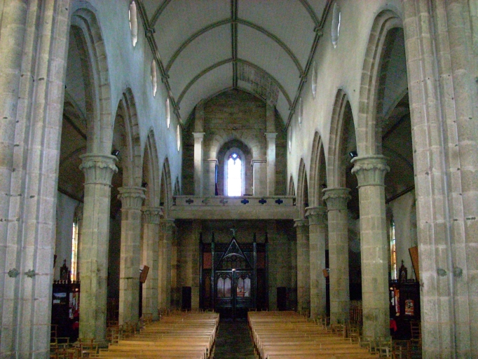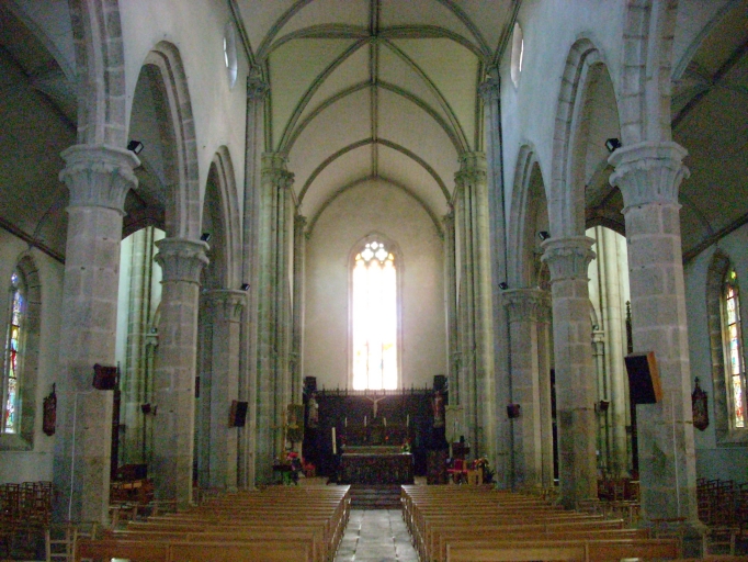 Plan en croix latine à trois vaisseaux. Chevet plat flanqué au sud d´une sacristie à comble à surcroît. Clocher à deux galeries et à deux étages de cloches amortis d´une flèche octogonale ajourée ornée de crochets et encadrée à sa base par quatre pinacles. Gros oeuvre en moellon de granite partiellement enduit de ciment, à l´exception de la façade ouest, des encadrements des baies et des chaînages d´angle, en pierre de taille de granite. Nef à cinq travées éclairée par des fenêtres hautes et couverte d´un lambris peint en blanc. Arcades en arc brisé reposant sur les chapiteaux des colonnes. Choeur flanqué de deux chapelles ouvrant aussi sur le transept. Sol couvert de dalles de granite.