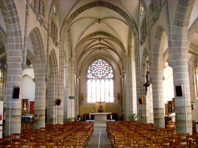 Plan en croix latine à trois vaisseaux. Chevet plat. Clocher hors-oeuvre à deux galeries et deux étages de cloches amortie d´une flèche octogonale ornée de crossettes et encadrée à sa base par quatre frontons ajourés et quatre lanternons. Gros oeuvre en pierre de taille de granite partiellement enduit. Nef à cinq travées éclairée par des oculi et couverte d´une voûte à croisée d´ogives. Arcades en arc brisé pénétrant directement dans les colonnes. Tribune à l'ouest. Sol couvert de dalles de granite.