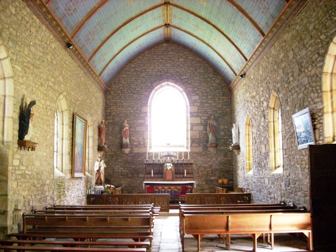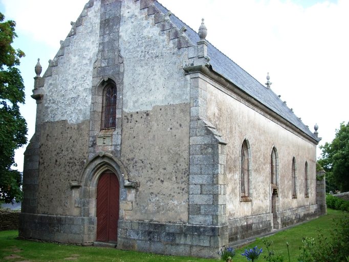 Plan rectangulaire à vaisseau unique. Chevet plat. Clocher-mur à chambre de cloches ajourée amortie d´une flèche conique. Gros oeuvre en moellon de granite partiellement enduit de ciment, à l´exception des encadrements des baies et des chaînages d´angle, en pierre de taille de granite. Lambris de couvrement peint en bleu. Sol couvert de dalles de granite.