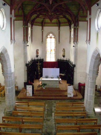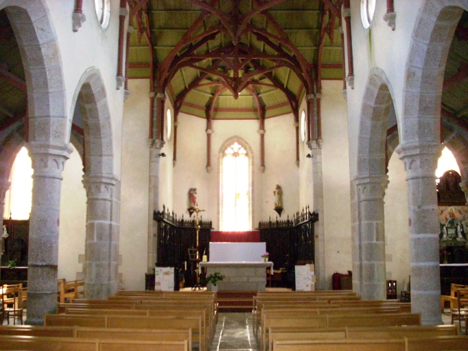 Plan en croix latine à trois vaisseaux. Chevet à pans coupés flanqué au sud d´une sacristie de plan carré à pans coupés à comble à surcroît. Clocher demi-hors-oeuvre à galerie en encorbellement et à deux étages de cloches amortis d´une flèche octogonales ajourée ornée de choux et encadrée à sa base par quatre gables ajourés et quatre pinacles. Gros oeuvre en moellon de granite enduit de ciment, à l´exception des encadrements des baies et des chaînages d´angle, en pierre de taille de granite. Nef à quatre travées éclairée par des oculi. Arcades en arc brisé reposant sur les chapiteaux des colonnes. Charpente apparente. Massif occidental portant tribune. Sol couvert de dalles de granite.