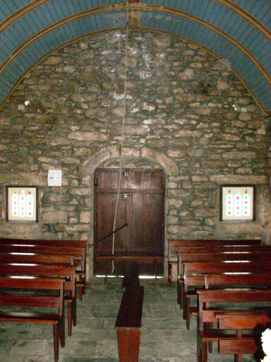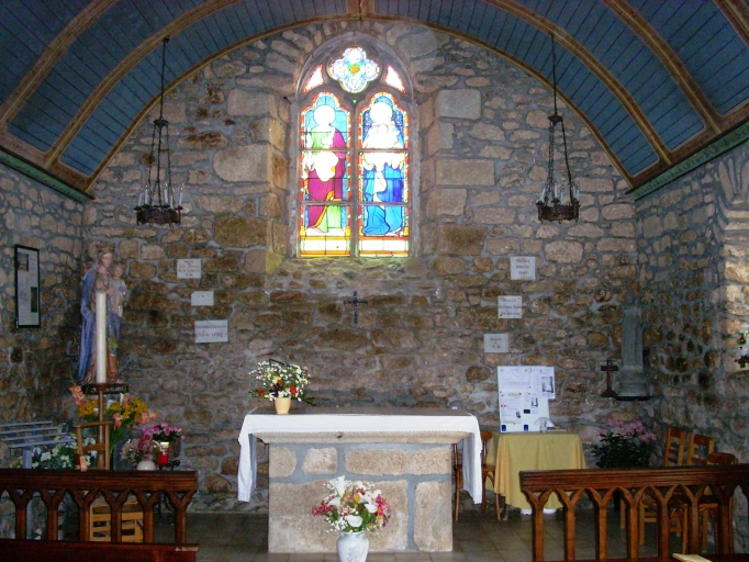 Plan rectangulaire à vaisseau unique. Chevet plat. Façade ouest surmontée d´un petit clocheton. Gros oeuvre en moellon de granite, à l´exception des encadrements des baies et des chaînages d´angle, en pierre de taille de granite. Lambris de couvrement peint en bleu et nervures en marron. Sol couvert de dalles de schiste.
