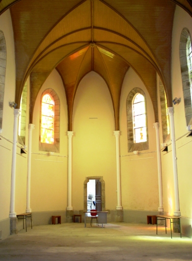 Plan allongé à vaisseau unique. Chevet à pans coupés flanqué d´une sacristie à l´est. Clocher-mur avec chambre de cloches ajourée amortie d´une flèche octogonale. Gros oeuvre en moellon de granite enduit de ciment, à l´exception des encadrements des baies et des chaînages d´angle, en pierre de taille de granite. Nef à trois travées couverte d´un lambris. Nervures reposant sur les colonnettes engagées de fond. Sol couvert de ciment.
