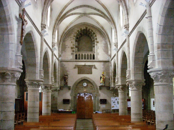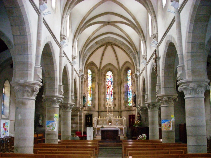 Plan allongé à trois vaisseaux. Chevet à pans coupés flanqué au sud d´une sacristie hors-oeuvre de plan rectangulaire à lucarne passante. Clocher hors-oeuvre à chambre de cloches ajourée amortie d´une flèche octogonale ajourée et encadrée à sa base par quatre frontons et quatre lanternons. Gros oeuvre en pierre de taille de granite. Nef à cinq travées couverte d´une voûte à croisées d´ogives éclairée par des fenêtres hautes. Bas-côtés couverts de lambris. Arcades en arc brisé reposant sur les chapiteaux des colonnes. Enduit ciment. Sol couvert de ciment.