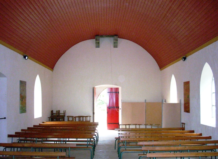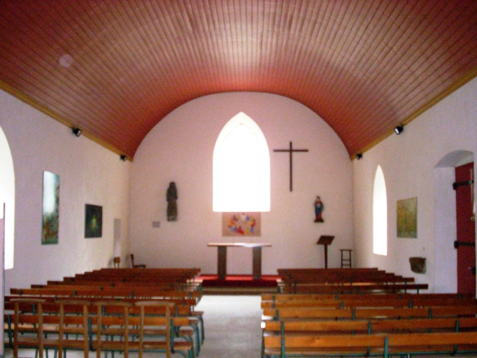 Plan rectangulaire à vaisseau unique. Chevet plat flanqué d´une sacristie au nord. Clocher-mur avec chambre de cloches ajourée amortie d´une flèche octogonale en charpente à égout retroussé de plan carré couverte d´ardoises. Gros oeuvre en moellon de granite enduit de ciment, à l´exception des encadrements des baies et des chaînages d´angle, en pierre de taille de kersantite. Lambris de couvrement. Sol couvert de ciment.