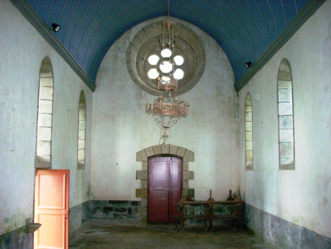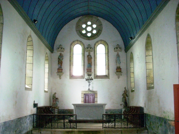 Plan rectangulaire à vaisseau unique. Chevet plat flanqué d´une sacristie à l´est. Pignon ouest coiffé d'une chambre de cloches ajourée amortie d´une flèche carrée ornée de crossettes et encadrée à sa base par quatre frontons. Gros oeuvre en moellon de schiste et de granite enduit de ciment, à l´exception des encadrements des baies et des chaînages d´angle, en pierre de taille de granite. Lambris de couvrement peint en bleu. Sol couvert de dalles de granite.
