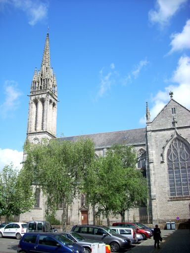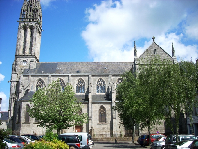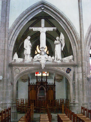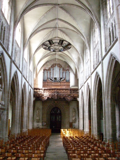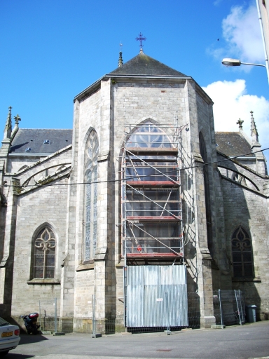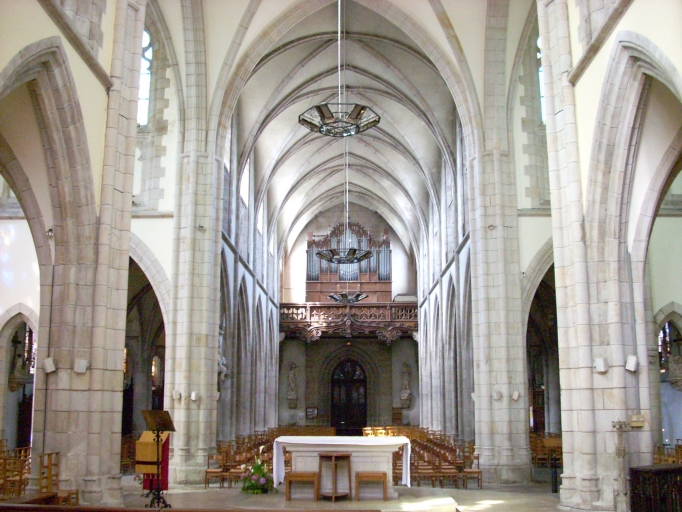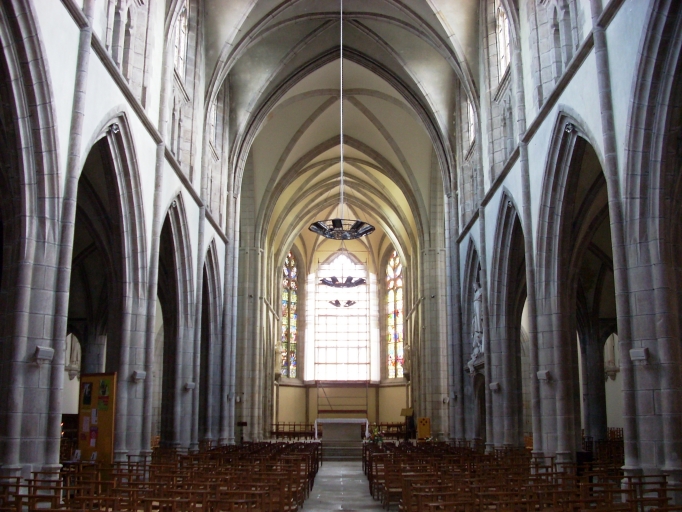 Plan en croix latine à cinq vaisseaux. Chevet à pans coupés. Clocher semi-hors-oeuvre avec chambre de cloches amortie d´une flèche octogonale ajourée ornée de crochets et encadrée à sa base par quatre lanternons et quatre frontons ajourés. Gros oeuvre en pierre de taille de granite. Nef à cinq travées couverte d´une voûte à croisées d´ogives éclairée par des fenêtres hautes. Arcades en arc brisé pénétrant directement dans les colonnes à colonnettes engagées. Choeur profond à deux travées flanqué de deux chapelles latérales ouvrant sur le transept. Massif occidentale portant tribune et orgue. Sol couvert de dalles de granite.