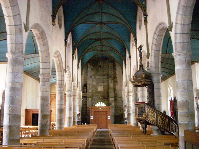 Plan en croix latine à trois vaisseaux. Chevet plat flanqué d´une sacristie hors-oeuvre de plan rectangulaire. Porche sud hors-oeuvre. Clocher à deux étages de cloches et à deux galeries amortis d´une flèche octogonale ajourée et encadrée à sa base par quatre lanternons et quatre gables ajourés. Gros oeuvre en pierre de taille de granite. Quatre chapelles latérales formant deux faux transepts au niveau des quatrième et sixième et septième travées. Nef à sept travées éclairée par des oculi et couverte d´un lambris peint en bleu à nervures peintes en marron. Arcades plein-cintre reposant sur les chapiteaux des colonnes. Sol couvert de dalles de granite.