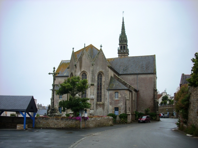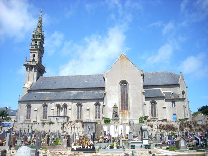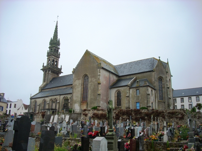 Edifice construit en 1860, à l'emplacement d'une église plus ancienne, d´après les plans de l´architecte diocésain Joseph Bigot. Les travaux furent ensuite dirigés par l´architecte et entrepreneur Trischler de Brest. Clocher de 1897 construit d´après les plans du maître-d'oeuvre Jean-Marie Abgrall, grâce aux dons de la reine d´Angleterre, en reconnaissance du sauvetage des rescapés (3 sur 243) du naufrage du paquebot Drummont Castle.