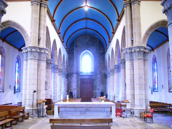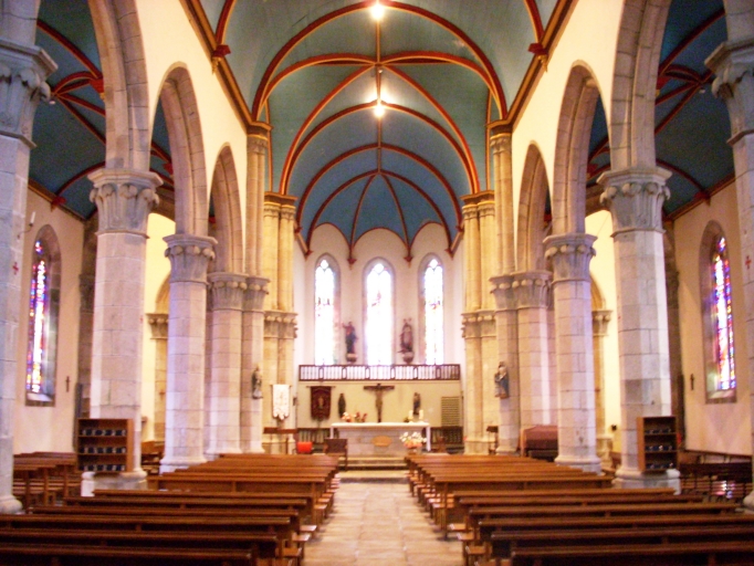 Plan en croix latine à trois vaisseaux. Chevet à noues multiples. Clocher hors-oeuvre à deux galeries et à deux étages de cloches amortis d´une flèche octogonale ajourée ornée de crochets et encadrée à sa base par quatre frontons ajourés et quatre lanternons. Gros oeuvre en moellon de granite enduit de ciment, à l´exception des encadrement des baies et des chaînages d´angle, en pierre de taille de granite. Nef à cinq travées couverte d´un lambris peint en bleu à nervures rouges et jaunes. Arcades en arc brisé reposant sur des chapiteaux corinthiens des piliers octogonaux. Choeur flanqué de deux chapelles latérales ouvertes sur le transept. Tribune à l'ouest. Sol couvert de dalles de granite.