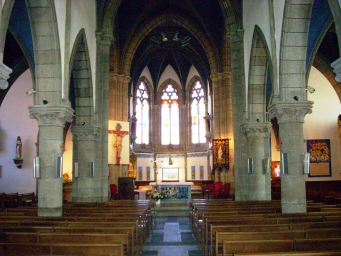 Plan en croix latine à trois vaisseaux. Chevet à pans coupés flanqué d´une sacristie au nord. Porche sud hors-oeuvre. Clocher à deux galeries et à deux étages de cloches amortis d´une flèche octogonale ajourée et encadrée à sa base par quatre frontons ajourés et quatre lanternons. Gros oeuvre en moellon de granite enduit à l´exception des encadrements des baies et des chaînages d´angle en pierre de taille de granite. Nef à quatre travées couverte d´un lambris peint en bleu étoilé. Arcades en arc brisé reposant sur les chapiteaux des colonnes. Choeur accosté de deux chapelles ouvrant aussi sur le transept. Sol couvert de ciment, dalles de granite et de schiste.