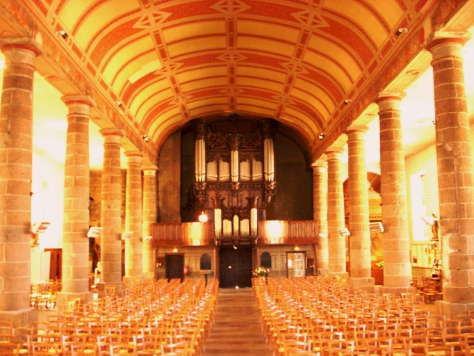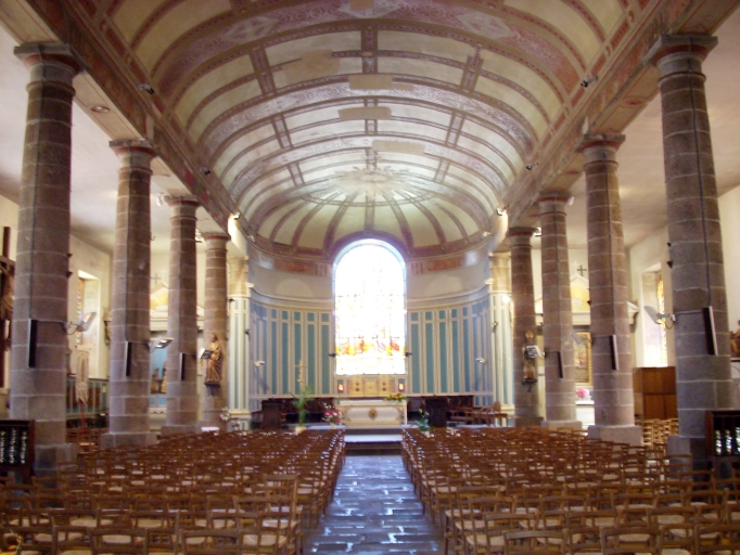 Edifice de plan rectangulaire à trois vaisseaux. Chevet plat flanqué d´une sacristie à l´est. Clocher hors-oeuvre à chambre de cloches sans flèche. Gros oeuvre en moellon de granite et de schiste enduit à l´exception des encadrements des baies et des chaînages d´angle en pierre de taille de granite. Nef à sept travées couverte d´un lambris peint à décors géométriques. Orgue à l´ouest. Architraves reposant sur des colonnes galbées du bas. Sol couvert de dalles de granite.