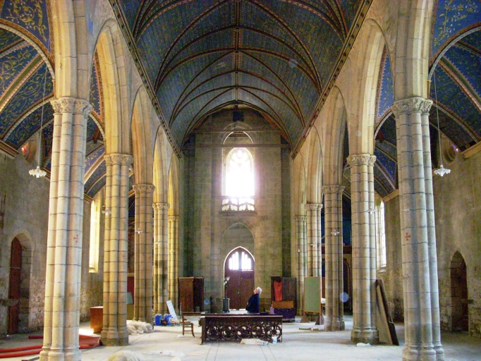 Plan en croix latine à trois vaisseaux. Chevet à noues multiples. Clocher à chambre de cloches amortie d´une flèche octogonale ornée de crossettes et encadrée à sa base par quatre frontons ajourés et quatre lanternons ceints d´une balustrade. Gros oeuvre en moellon de granite et de schiste enduit, à l´exception des encadrements des baies et des chaînages d´angle, en pierre de taille de granite. Nef à six travées couverte d´un lambris peint. Arcades en arc brisé reposant sur les chapiteaux des piliers à noyau carré flanqué de colonnettes. Sol couvert de ciment.