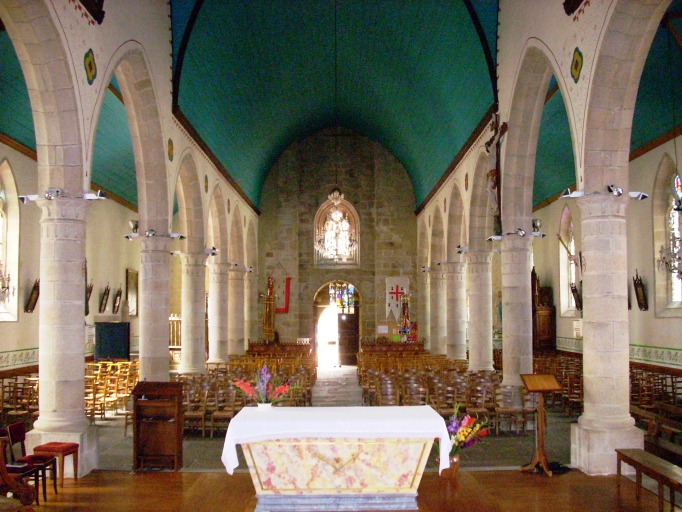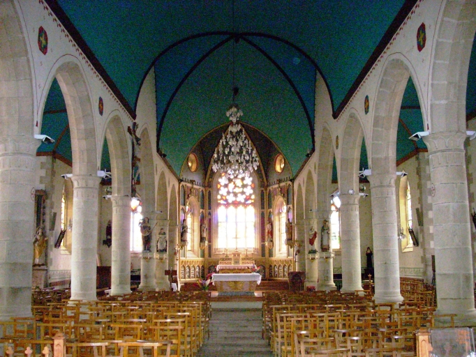 Plan en croix latine à trois vaisseaux. Porche sud hors-oeuvre. Chevet à noues multiples. Clocher-mur flanqué d´une tourelle cylindrique abritant un escalier en vis, chambre de cloches ajourée ceinte d´une galerie et amortie d´une flèche ornée de crossettes et encadrée à sa base par quatre gables ajourés. Gros oeuvre en moellon de granite enduit à l´exception de la façade occidentale, des encadrements des baies et des chaînages d´angle en pierre de taille de granite. Nef à sept travées couverte d´un lambris. Arcades en arc brisé reposant sur les chapiteaux des colonnes. Chapelles latérales au niveau de la cinquième travée formant faux transept. Sol couvert de dalles de granite.