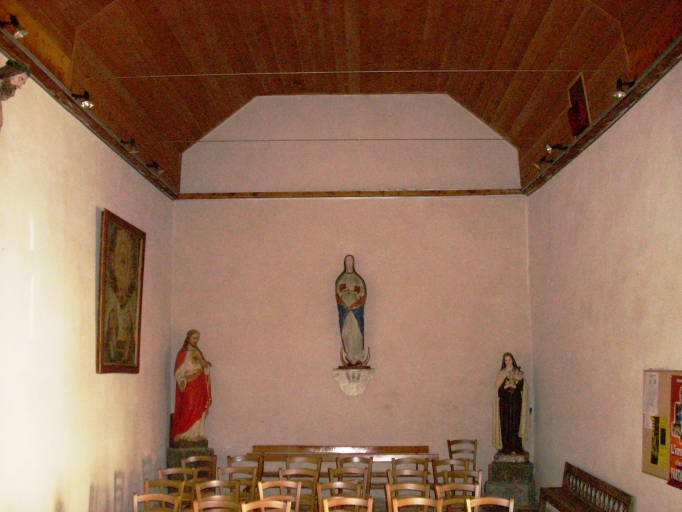 Plan rectangulaire à vaisseau unique. Chevet plat. Clocheton médian. Gros oeuvre en pierre de taille de granite. Lambris de couvrement.